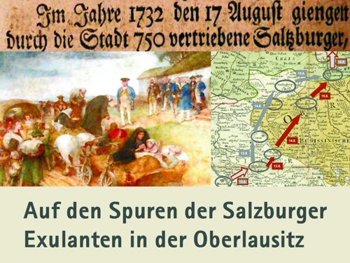 Im August des Jahres 1732 herrschte in Königsbrück und Hoyerswerda große Aufregung. Es war angekündigt worden, dass mehr als 500 Exulanten aus dem Salzburger Lande durchziehen und sogar eine Nacht dort verbringen sollten. Damals, als so mancher Einwohner zeit seines Lebens nicht über die Stadtgrenzen hinauskam, war das eine große Sensation. Noch dazu, als bekannt wurde, dass diese Menschen ihres protestantischen Glaubens wegen die Heimat verlassen hatten und auf dem Durchzug in eine unbekannte Fremde waren. Historische Dokumente aus Archiven und Kirchenbüchern geben Auskunft über den Aufenthalt und den weiteren Weg der Exulanten durch das Markgraftum Oberlausitz nach Hoyerswerda und über Ruhland nach Senftenberg. Nach beschwerlichem Marsch kommen sie, dem Ruf des preußischen Königs Friedrich Wilhelm I. folgend, im November 1732 in Preußisch-Litauen, dem späteren Ostpreußen, an.