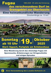 In diesem Jahr jährte sich am 23. September der Tag der Sprengung der Kirche St. Wenzel zum 65. Male. Damit verschwand mit das kleine Örtchen Fugau endgültig von der Landkarte, nicht aber aus dem Gedächtnis und den Herzen der Menschen. Vor diesem Hintergrund war auch die Idee geboren, Euch zu dieser besonderen Wanderung in die Fuge einzuladen. Die fachkundige Wanderleitung wird diesmal Heimatfreund Dietmar Eichhorn, Leutersdorf, übernehmen. Die Gesamtlänge der Rundwanderung beträgt etwa 15 Kilometer und führt uns durch den Fugauer Zipfel bis nach Rosenhain (Rožany) und wieder zurück.